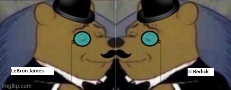 La realidad es que me ha gustado mucho, aunque que me traten como a un niño de 6 años. Los dos se creen muy listos, y es que lo son. No están haciendo algo tan novedoso como se creen, porque tanto en Game Theory (Sam Vecenie) como en The Dunker Spot (Nekias Duncan y Steve Jones) se habla mucho de jugadas, sistemas, etc. (Redick lo sabe, tiene contratados a Duncan y Jones), pero ninguno de ellos podría ser nunca tan conocido como un podcast en el que salga LeBron James.